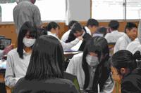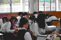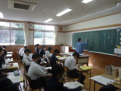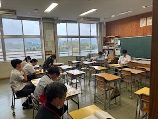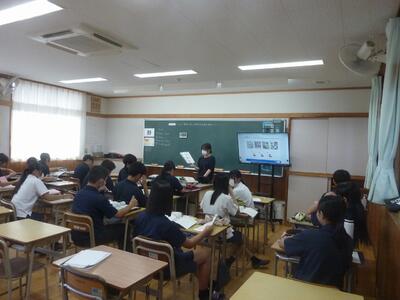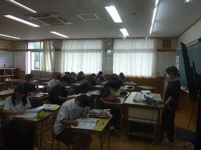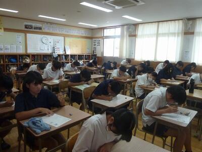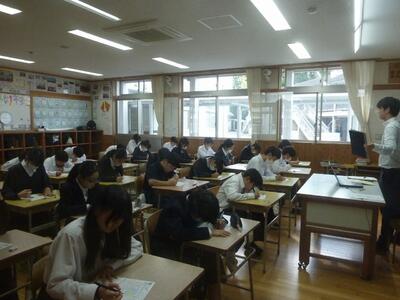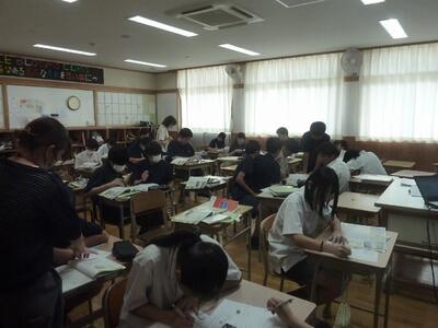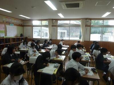 1組は家庭科で「世界の国々の料理」について、特徴を考えていました。2組は国語で古典の基礎「いろは歌」。3組は社会で「単元テスト」を集中して受けていました。