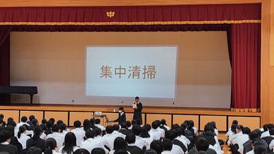 全校美化委員長と副委員長より、「日向中の〇〇清掃」のアンケート結果が発表されました。ここからは『集中清掃』を意識して、学校を磨いていきます!目標を達成するために、まず、自分たちが頑張れていること、そして清掃に関する課題についての説明がありました。頑張れていることは、清掃にふさわしい服装を整えて、清掃前の黙想をしてメリハリがついていること。反面、良くない点としては清掃場所を守らず、勝手な場所に移動して遊んでいる人がいるということ。