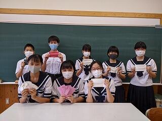 本年度は、新型コロナウイルス感染防止のため予定した計画どおりにはいきませんでしたが、この時期喜んでもらえるものとして、「手作りマスク」を贈り物にできないかと考えました。学校も臨時休業に入り、家庭での製作が中心となりましたが、呼びかけに多数の生徒の皆さんが協力してくれ、現在までに、約30枚ほどが完成しました。