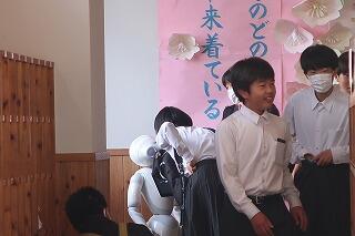 生徒玄関を入ると、今朝はペッパーくんも”あいさつ運動”を行っていました。