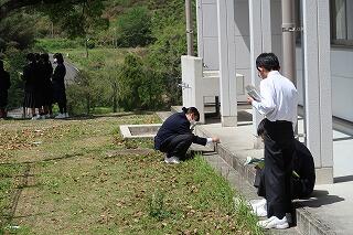 青空の下、運動場では体育の授業を行っていました。また校舎周辺では1年生が理科の授業で校内の植物を調べていました。