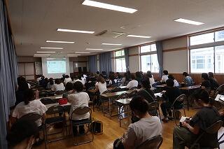 来校された保護者の皆様には視聴覚室で、生徒は各教室で視聴しました。スライドを使い、丁寧でとてもわかりやすいご講演で、改めて睡眠の大切さや小中学生がスマホなどを夜間、特に夜遅くに使用することの目や脳へのダメージなど、体や心に対する危険性を認識する時間になりました。