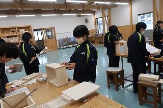 1年生の技術の授業は木材加工を勉強していて、「ラック」を製作しています。最近の子どもたちは、のこぎりや金槌を使う機会があまりないので、技術の授業はとても貴重です。苦労しながらも少しずつ道具の使い方に慣れ、生に一つだけの自分の作品をつくっていました。