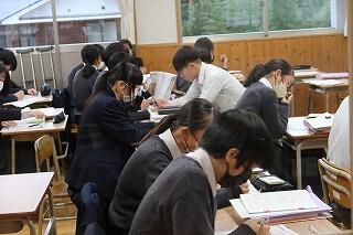 1時間目の授業のようすです。各学年・各教科で工夫された授業や単元テスト、学び合い、3年生は入試対策の問題などに取り組んでいました。