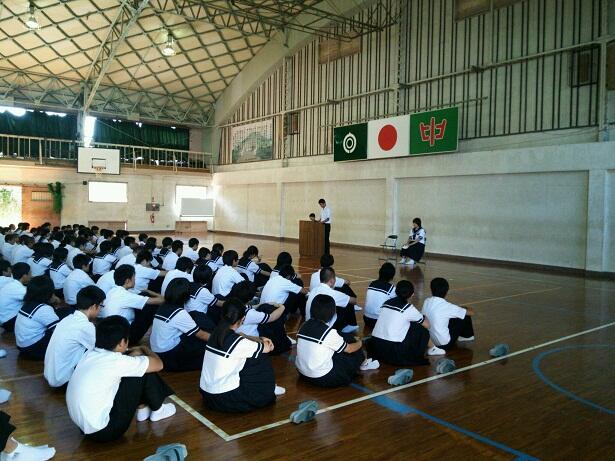 日に焼けた元気な笑顔が体育館に集まり始業式を行いました。2学期は,体育大会(9月22日予定),10月19日に文化祭「緑風祭」など行事が多くあります。