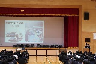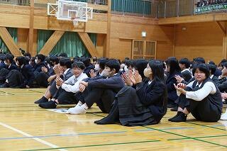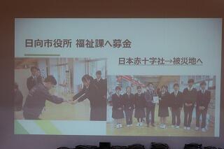 日向中生徒会は、「能登半島地震義援金のための有償ボランティア」を2月末から3月にかけての週末に5日間行いました。そこで得た「謝金81,206円」を義援金として日向市役所福祉課に届けました。その報告会を3月14日(木)に行いました。活動の場をご提供いただきました企業や地域の皆様、ご協力ありがとうございました。