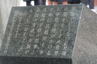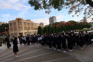 平和記念公園の最後は平和集会です。黄色く色づいた木々を眺めながら「原爆の子の像」に移動して平和集会を行いました。代表生徒が誓いの言葉を発表し、鐘を鳴らした後、全員で黙祷を捧げました。
