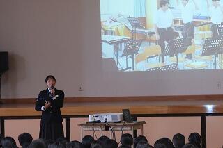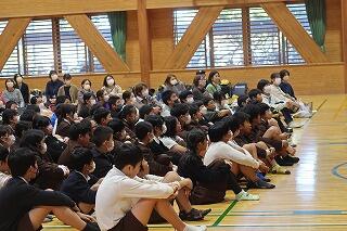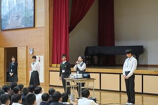 後半は、新生徒会役員が中心となって行った学校紹介を体育館行いました。学校紹介では、旧生徒会役員(3年生)が作成した動画で学校行事や生徒会活動の紹介でした。また部活動紹介では、各部のキャプテンや部長が写真や動画を使いながら練習のようすや今年度の成績を説明しました。