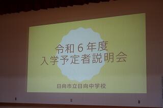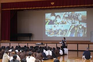 前半は、保護者を対象とした学習面や生活面、入学までの準備物についての説明を行いました。その間、児童は中学生の授業を参観し、その後は体育館で中学1年生と一緒に「牧水カルタ」を実施しました。読み手は、日向若山牧水顕彰会・若山牧水記念文学館の方です。塩見小・富高小・日向中の児童生徒が交流する楽しい時間になりました。