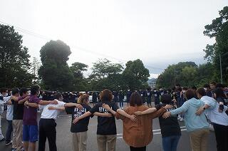 今日の試合に向かうサッカー部が学校に集合し、保護者と一緒に円陣を組み、士気を高めていました。いざ出陣サッカー部!