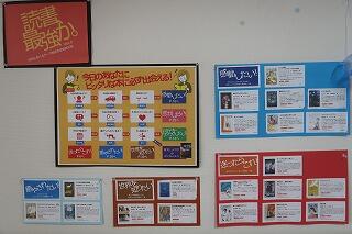 図書館前の掲示物です。新刊本の紹介がしてあり、夏らしい掲示になっています。