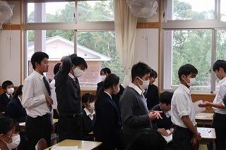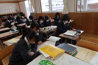 今日も1時間目と2時間目にテストがあり、3時間目からはいつもの授業風景でした。5時間目に授業の様子を見に行くと、採点の終わった答案用紙が返ってきている授業やテストの解説の行われている授業がありました。中には、教科書や資料集を見ながら、テスト問題をもう一度解いている授業もありました。運動場の体育の授業では、元気よくボールを追いかけている生徒の姿がありました。