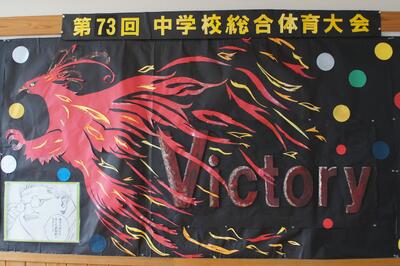 また、生徒玄関には、3年生の部活動生の写真とともに、「Victory」の文字と火の鳥のモチーフから成る掲示作品が飾られています。