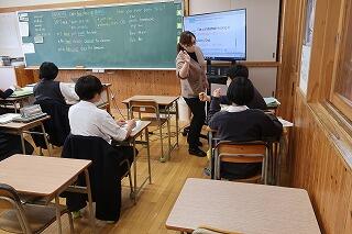 2年生の英語の授業のようすです。「現在完了形」の勉強をしていました。会話文をデジタル教科書を見ながら読みを全体で確認し、その後はペアワークで英語を使った会話を練習していました。
