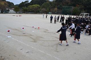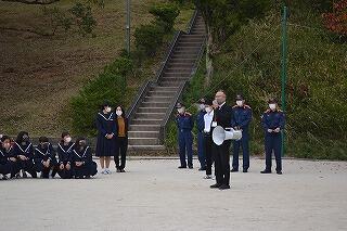 授業中に、校舎から火の手があがり、運動場に全校生徒が避難するという訓練です。その際、生徒の動きも大切ですが、職員の消防署への通報や避難誘導等もきちんとできていたかを検証しました。