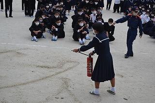 お話のあと、実際に消火器の使い方を説明していただき、代表の生徒が実際に体験しました。最初は、本物の中身ではなく、水による消火体験です。