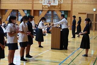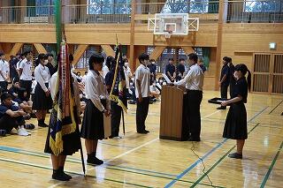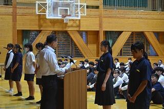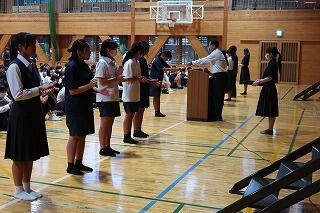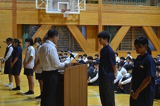一昨日(10月21日(月))の6時間目は体育館で表彰集会を行い、先月行われた地区秋季大会と英語暗唱・弁論大会入賞者の表彰しました。今週末には県中学校秋季体育大会が開催され、今回表彰された生徒も出場します。活躍を期待しています。