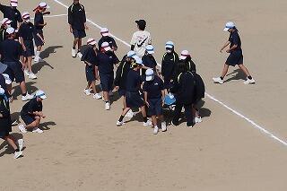 午前中は学年ごとに団技の練習を行い、1年生はグラウンドの石拾い、3年生は閉会式で歌う校歌の練習もしていました。