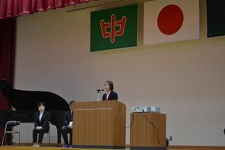 新任式では、転入された先生たちが一人ずつあいさつを行い、最後に代表生徒が歓迎の言葉を述べました。