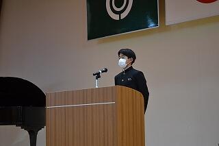 1年生の代表の上野君は、「授業中の発表が少なかった」ことや、「家庭学習があまりできなかった」こと等をあげました。クラスの雰囲気は明るく、仲も良かったが3学期は私語等のけじめをつけて、一層努力したいという内容でした。2年生の安藤君は、行事の充実をあげ、合唱コンクールや体育大会の成功をあげていました。しかし、慣れによる集中力の欠如等改善点もあるので、時間を意識して努力したいという内容でした。3年生の奈須さんは、1年間を漢字一文字で表すと「躍」という飛躍できた年だったようです。いよいよ受験を控え、入試の意義を考えながら時間を有意義に使い、メリハリのある生活をしていき夢を実現させたいという意欲を感じました。生徒会代表の山﨑さんは、各専門委員会の取組を振り返り、今後、「貢献」の目標に向かって一人一人が支え合い、3学期をがんばりたいと強く述べました。