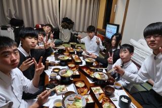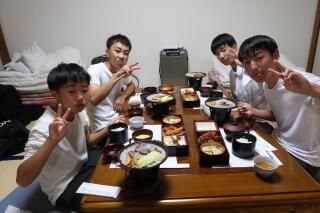 部屋長会や班会を終えた後は待ちに待った夕飯。男子の部屋では何杯もおかわりをする元気な姿がありました。