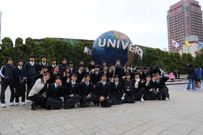 バスは高速道路を走り、楽しみにしているUSJに到着しました。途中には甲子園球場も見えました。