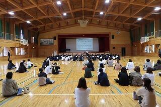 1年生の参観授業は、体育館に生徒と保護者が集まり、学年全体でスマホやインターネットなど、「情報モラル」について学習しました。