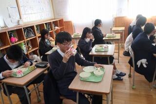 少し早いのですが、今日の給食にはデザートとしてケーキが出ました。ケーキは3種類あり、事前に学級ごとに種類を決めていて、最も多かったのはチョコレートケーキでした。また、スープには星の形のにんじんやパスタが入っていました。