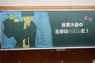 教室からは今日の体育大会に向けて気合いを入れている学級もあり、元気な声が聞こえてきました。黒板に今日の意気込みが書いてある学級もありました。