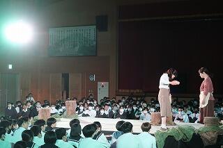 午後は「劇団 こふく劇場」にお越しいただき、体育館で鑑賞教室を行い、「キツネのしあわせ図書館」という演劇を鑑賞しました。劇の前には国語の教科書に載っている物語や短歌の朗読を聞き、抑揚のある読み方に感動しました。劇の途中には生徒や先生も出演し、一緒に楽しむこともできました。楽しく笑える場面や生き方を深く考えさせられる場面があり、あっという間に時間が過ぎ、とてもよい劇を間近で見ることができました。