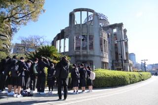 新幹線で広島駅に到着した修学旅行団は、路面電車で原爆ドームに向かいました。記念公園では、ガイドさんから説明してもらいながら碑めぐりをしました。