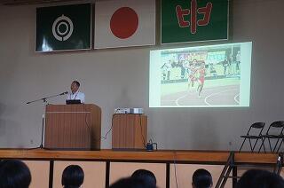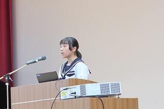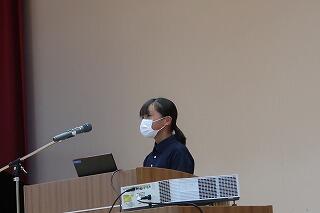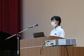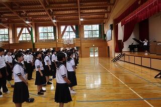 始業式は代表生徒4名の「2学期の抱負」発表と校長の話、校歌斉唱を体育館で行いました。その後、エアコンの入った教室に戻り、担当の先生が放送で学習面や生活面、保健面などの話をしました。