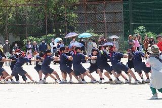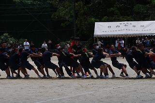 昼食・休憩後は「団対抗綱引き」と「団対応リレー」を行いました。このうち、綱引きの対戦は3回です。それぞれの対戦ごとに勝ったチームに得点が入りました。