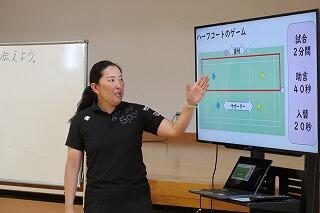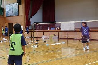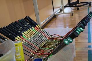 フロアに大型扇風機を置き、熱中症対策がしてありました。授業後、生徒が使用したラケットはきれいに並べてケースに片付けてありました。