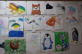 校舎1階の掲示板に2年生が美術の授業で制作した作品が掲示してあります。テーマは「はらぺこ○○」。コラージュという技法を使った作品で、色のついている部分は、白画用紙に絵の具で色をつけ、それをちぎって貼り付けてあります。