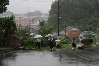 今朝、生徒は雲空の下で登校していましたが、7時50分頃から急に雨が降り始め、「希望の坂道」を上がってきていた生徒は制服が濡れてしましました。今日は前が降る時間が多く、「5のつく日は外へGO!」の取組はできませんでした。