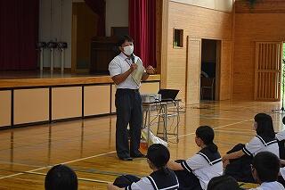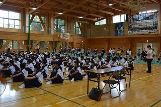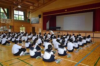 6月25日(金)の5、6校時に、体育館で私立高校説明会が実施されました。対象は3年生と、その保護者です。3年生にとって、いよいよ自分の進路を決める大切な時期となってきました。今回は、日章学園高校、宮崎日大高校、聖心ウルスラ学園高校、延岡学園高校の4校の説明でした。各学校の先生から、直接高校の特色を教えていただき、生徒の皆さんにとって、充実した時間になったようです。また、各校のプレゼンも工夫がなされ、真剣に話を聞いている生徒の皆さんの凜々しい姿が印象的でした。