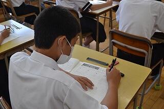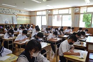さて、本日と明日の2日間、学期一回の定期テストが始まりました。国、社、数、理、英の5教科のみですが、生徒の皆さんはこの日のために猛勉強をしてきたことと思います。また、今回、中学校のテスト期間に合わせて、「日向中校区ノーメディア・デー」を校区の小学校も含めて設定しました。これは、6月24日(木)~30日(水)の間、スマホ、テレビ、ゲーム等のすべての電子機器をOFFにして生活習慣の改善や勉強に集中する環境をつくろうというものです。テストを受けている表情は真剣そのもの。よい結果がでるといいですね。