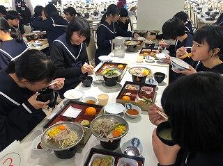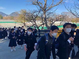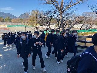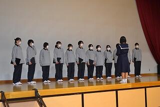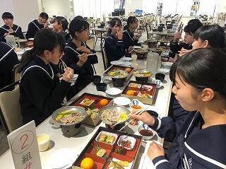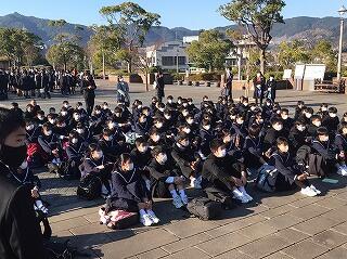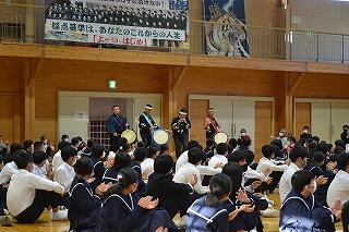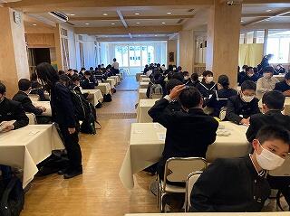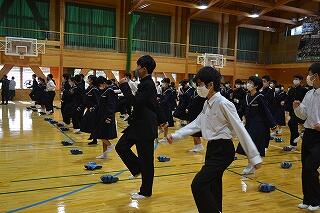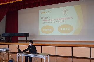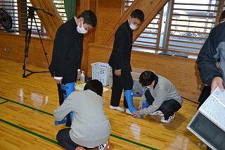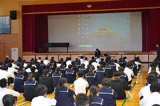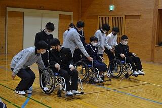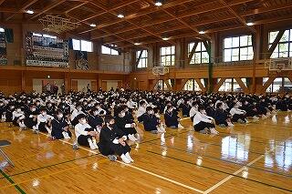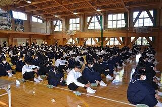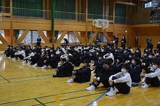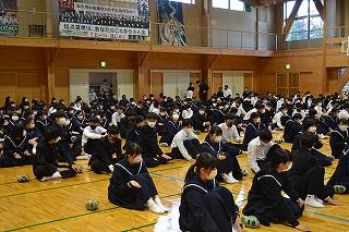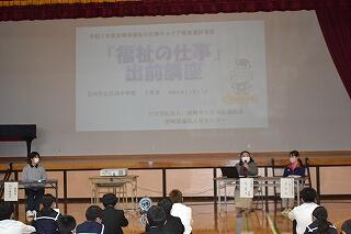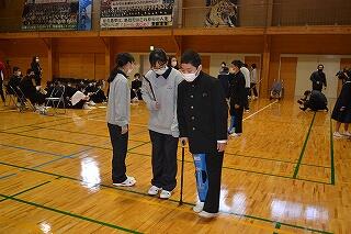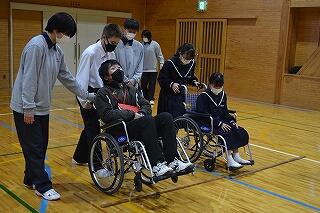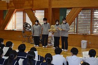 12月17日(金)の午後、本校の1年生を対象に、福祉体験学習が実施されました。この行事は、県の福祉保健部長寿介護課が中心となり、「地域の福祉系高校と中学校との交流学習にをとおして、中学生が介護に興味関心を持ち、福祉系の高校・就職先を将来の進路選択の一つとして考えてもらいたい」との願いのもと計画されました。当日は、県立門川高校福祉科の生徒さん14名と、県社会福祉協議会の方、特別養護老人ホームで実際に介護のお仕事をされている方が来校され、講話や、レクリエーション、高校生によるプレゼンテーション、介護体験学習等が行われました。