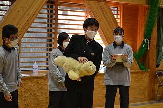 この動物のぬいぐるみは、実はロボットで、あやしたりすると、自分で気持ちよさそうな表情や、鳴き声を出したりします。さわった生徒はもちろん、見ている生徒「かわいい~」の声が聞こえてきます。そう、これは、寂しさを感じる高齢者の方を癒やす働きのあるロボットでした。欲しいな~と思い値段を聞くと・・・すごい値段でした。