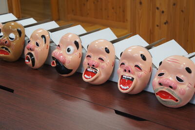 みんなが身に付けているこのお面は、7月13日(水)にお面製作者の河野道雄さんが夏祭りで使って欲しいと日向中に寄贈していただいた貴重なものです。残念ながら夏祭りは中止となりましたが、浦添市の皆さんの前で、このお面をつけて踊ることができました。