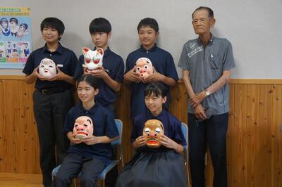 みんなが身に付けているこのお面は、7月13日(水)にお面製作者の河野道雄さんが夏祭りで使って欲しいと日向中に寄贈していただいた貴重なものです。残念ながら夏祭りは中止となりましたが、浦添市の皆さんの前で、このお面をつけて踊ることができました。