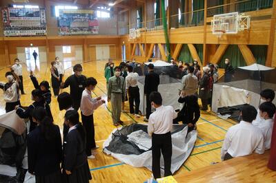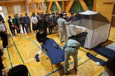 その後は、広見地区の皆さんと広見地区に住む生徒を対象に、防災推進課の皆さんによる講習会が行われました。内容は、体育館に付設されている防災用の備蓄倉庫の見学、避難用テント・ベッドの組み立て体験、避難食の試食です。