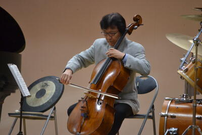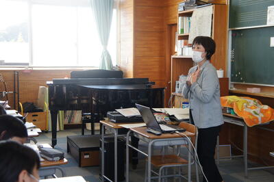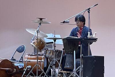 アンサンブルSELECTIONは、ピアノ・サクソフォン・チェロ・パーカッション・ボーカルの5名の皆さんからなるアンサンブルです。全校生徒が体育館に集まって生演奏を聴くのは久しぶりのこと。パーカッションの服部央さんの愉快なおしゃべりに導かれ、リズムを取ったり、歌ったり、体全体を使って音楽を楽しみました。