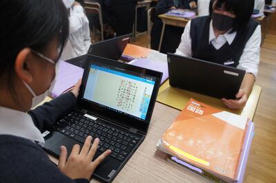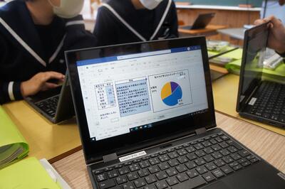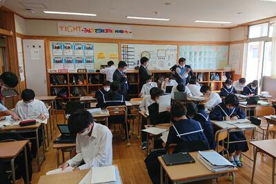日向中学校は、今年度宮崎県教育委員会のICT推進モデル校の指定を受けています。生徒1人に1台配付されているタブレットを、いかに効果的に学習に活用するか、そのために教師のICT活用・指導能力をどのように高めるか、について研究してきました。
