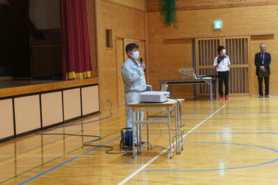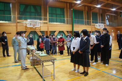 その後は、広見地区の皆さんと広見地区に住む生徒を対象に、防災推進課の皆さんによる講習会が行われました。内容は、体育館に付設されている防災用の備蓄倉庫の見学、避難用テント・ベッドの組み立て体験、避難食の試食です。