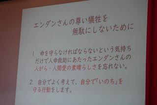 集会ではこの事故の原因や水難事故の状況、離岸流などについて担当の先生が説明し、命の尊さや自分で「命を守る」行動の大切さについて生徒に考えさせました。