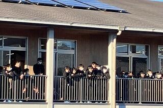 天気予報では今日の天気は「晴れのち曇り、気温も3月並の暖かさ」ということでしたが、2時間目の授業が始まる頃には雲が広がっています。曇り空の下、運動場では体育の授業ではサッカーをしていました。