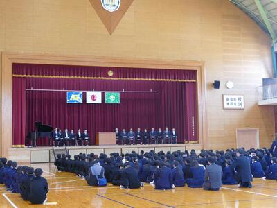 式では、代表生徒が「今年度を振り返って」の作文を発表し、この1年間の成長や今後への決意を堂々と述べました。その後、各学年の代表生徒に修了証が授与され、校長先生より高校入試制度の変更のことや新年度に向けたお話がありました。