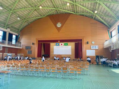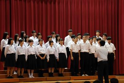 午前中は体育館にて、各学年ごとに合唱コンクールが行われました。澄んだ歌声が体育館に響き渡り、生徒たちは練習の成果を存分に発揮しました。他学年の生徒は各教室からオンラインで鑑賞しました。